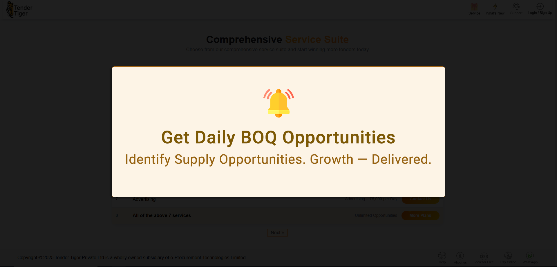 A tender for bridge construction may require cement, sand, machinery, manpower — even laptops and vehicles for project managers. With Tender Tiger’s BOQ/BOM Opportunities, you can uncover these hidden supply needs and grow your business.